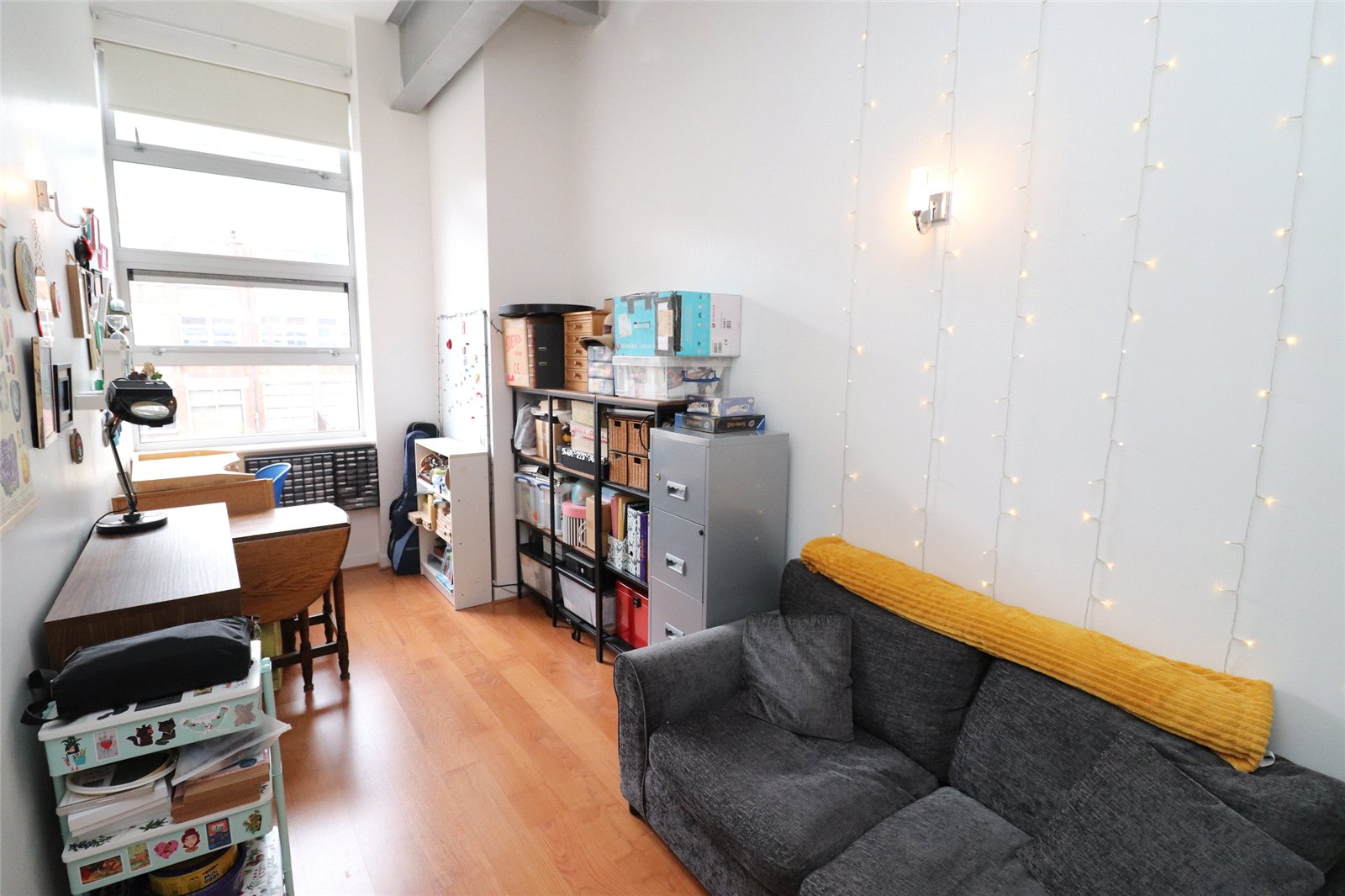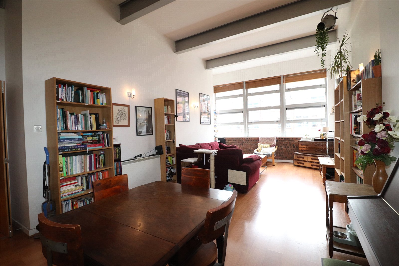 A large open-plan living area with high ceilings, laminate flooring, storage heater, exposed steel & brickwork, and three large windows to the front aspect overlooking the communal garden.