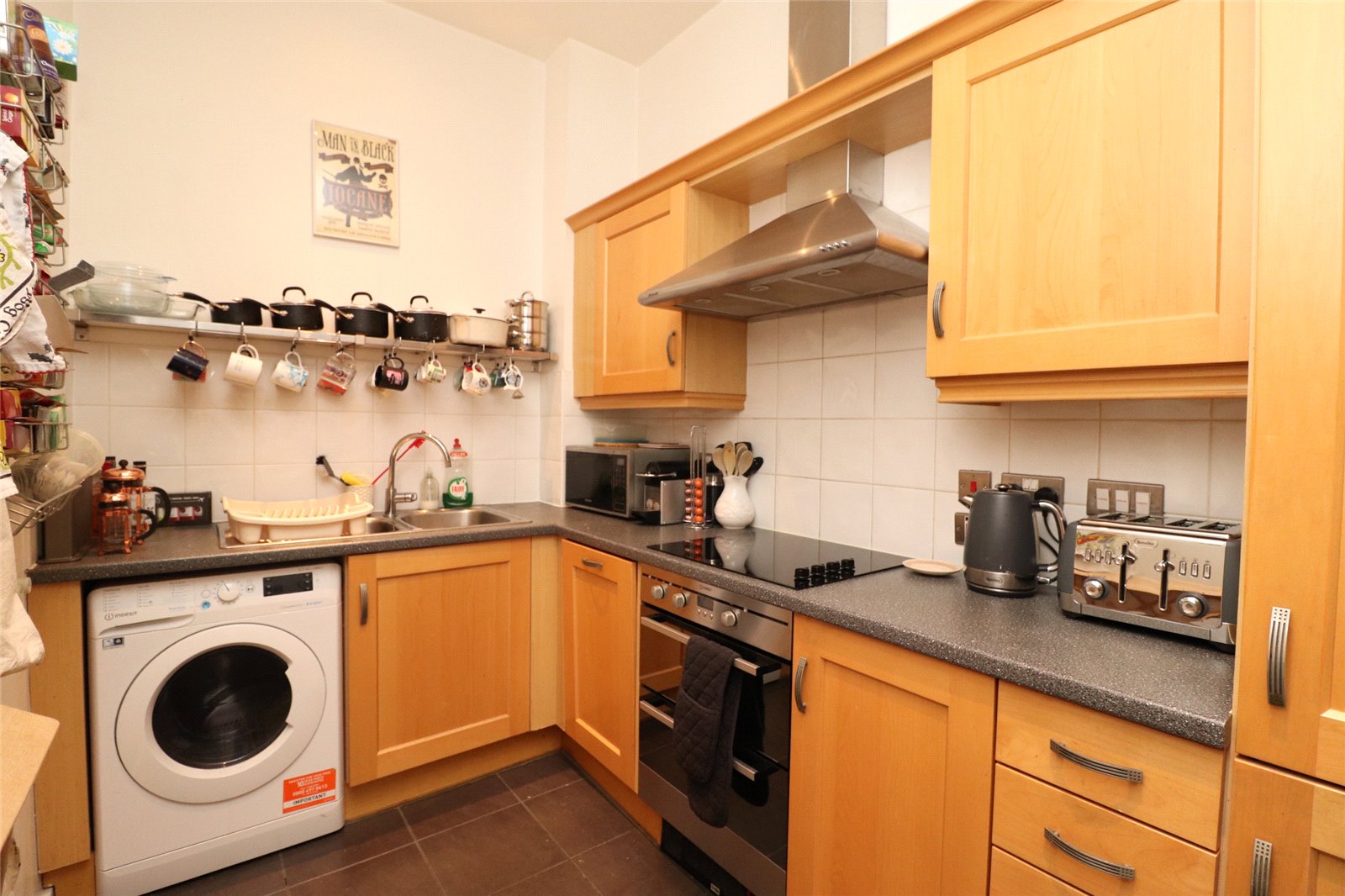 A good sized kitchen with tiled flooring and part-tiled walls. The kitchen suite comprises wall and base cabinets with countertop above. Integrated appliances include; electric oven with hob and extractor fan above, washing machine, and dishwasher. There is space for further cabinets if required.
