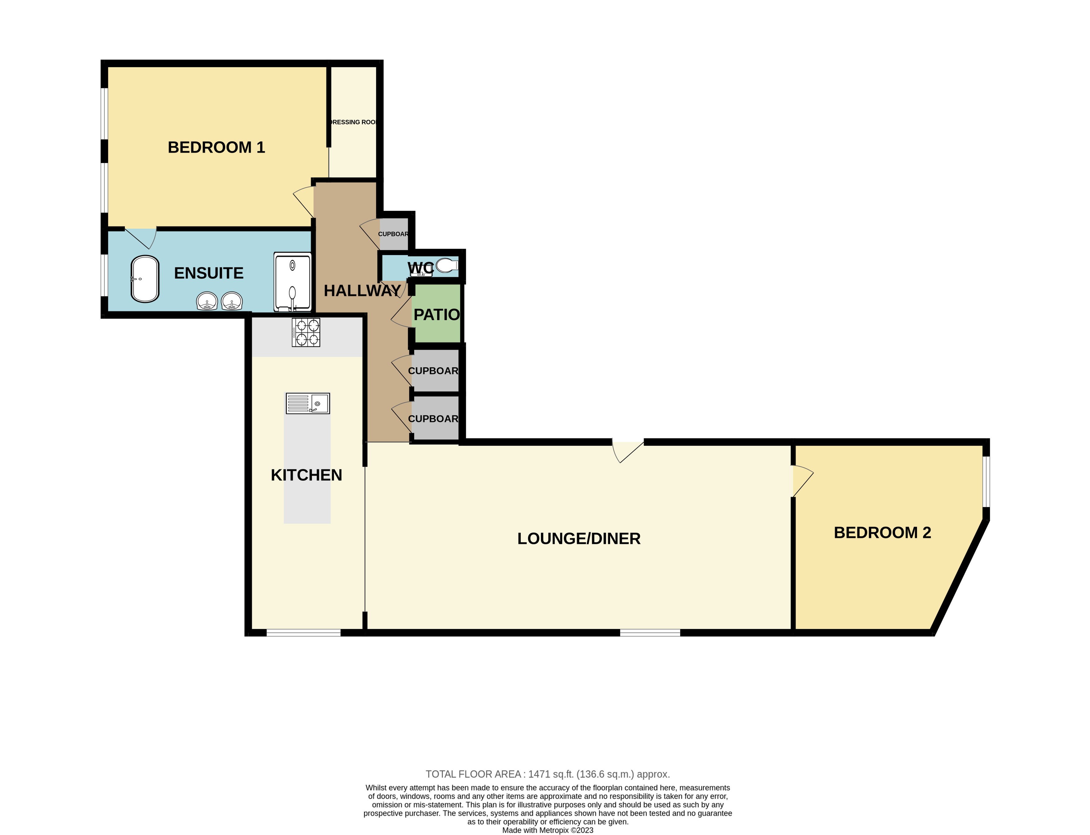 Accessed from the living room leading to the first bedroom with three storage cupboards and a bathroom off, with a door leading to the patio.