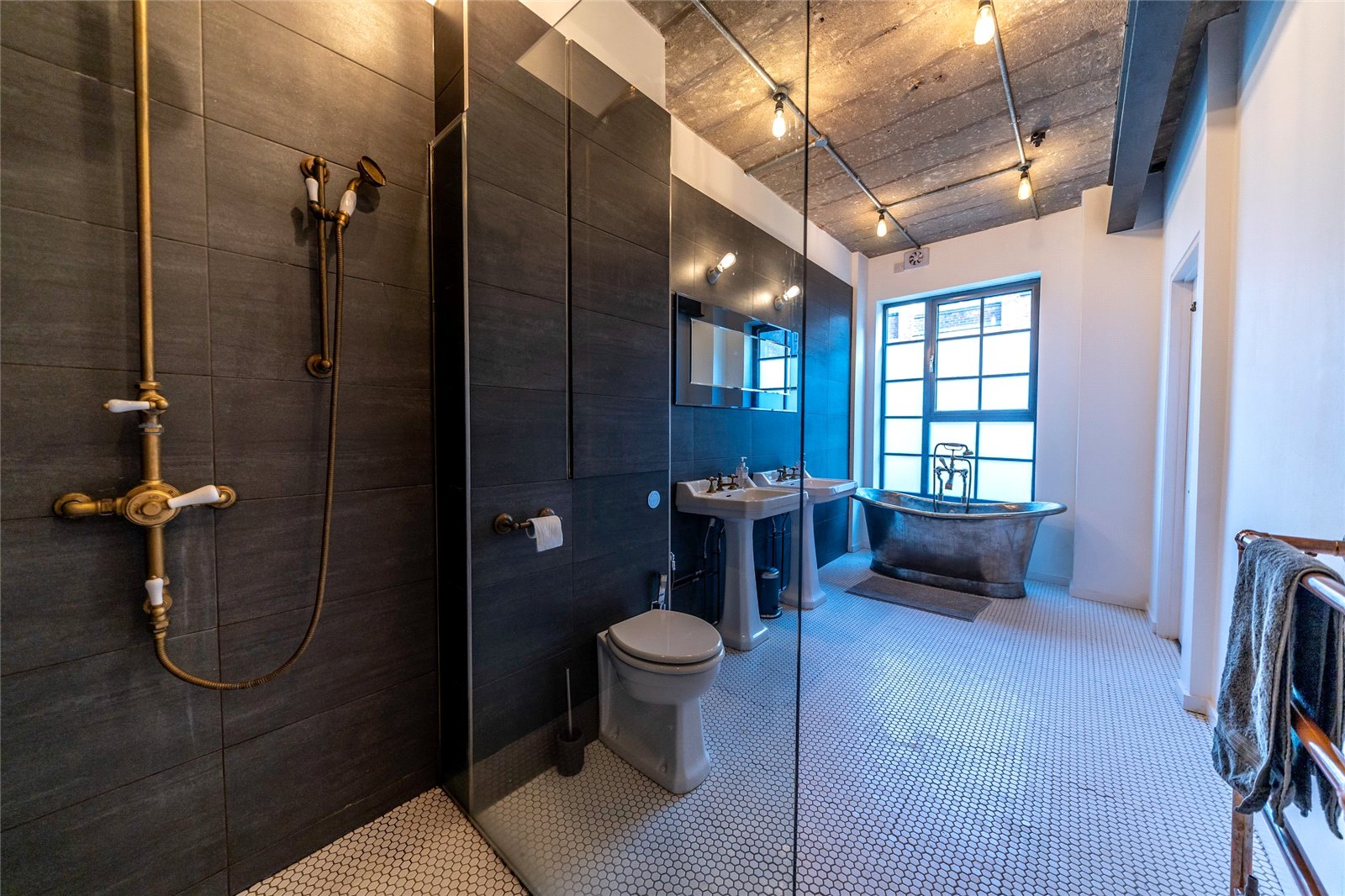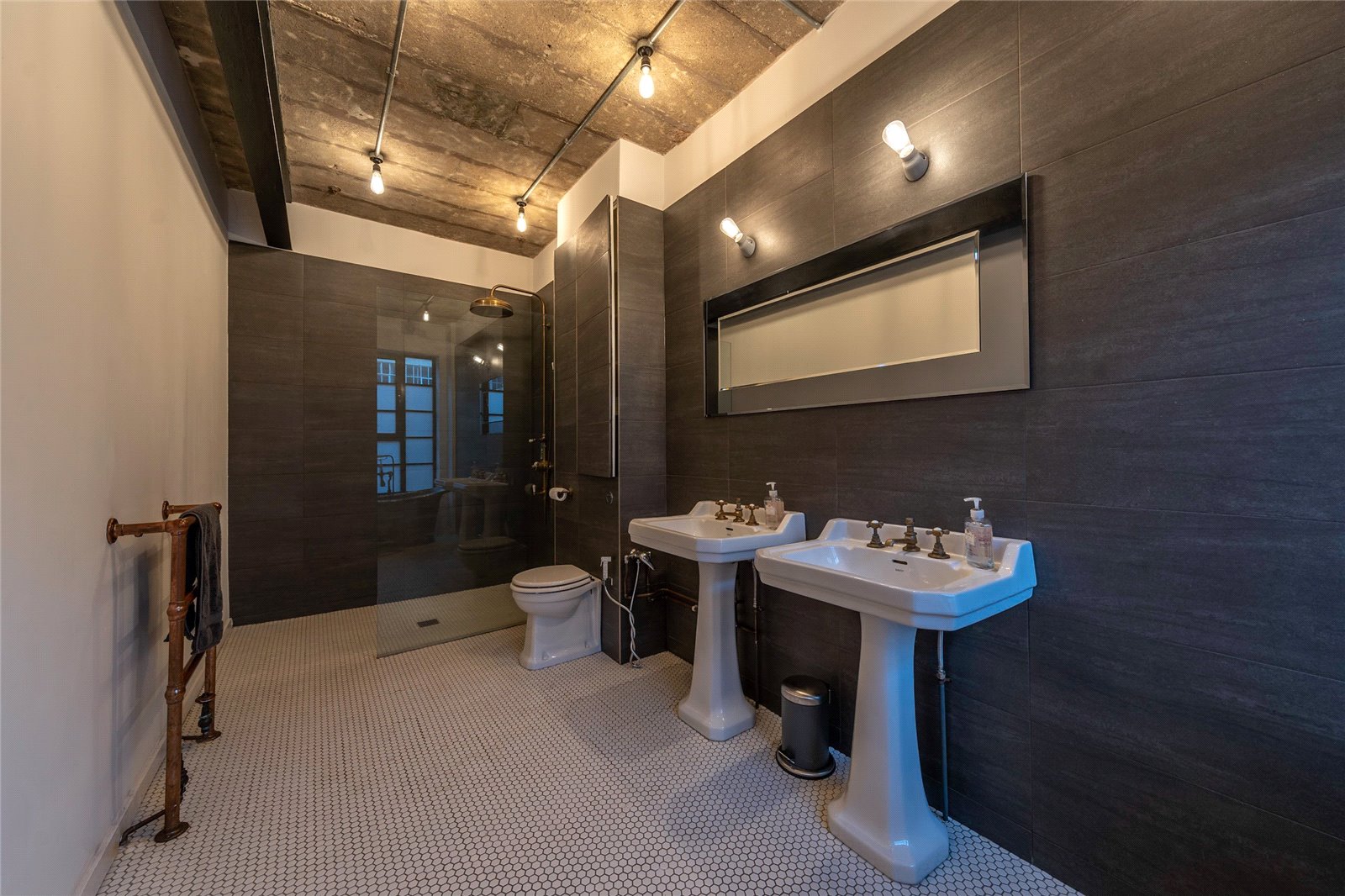 A large ensuite bathroom with tiled flooring and part-tiled walls, standalone bath, dual-wash basins, wc, walk in shower unit with rainfall shower, and a heated towel rail.