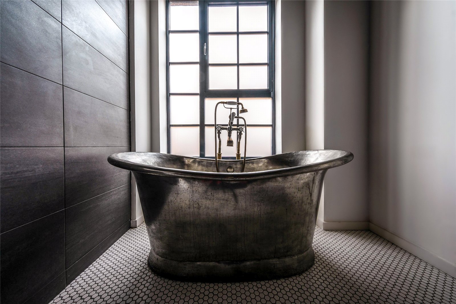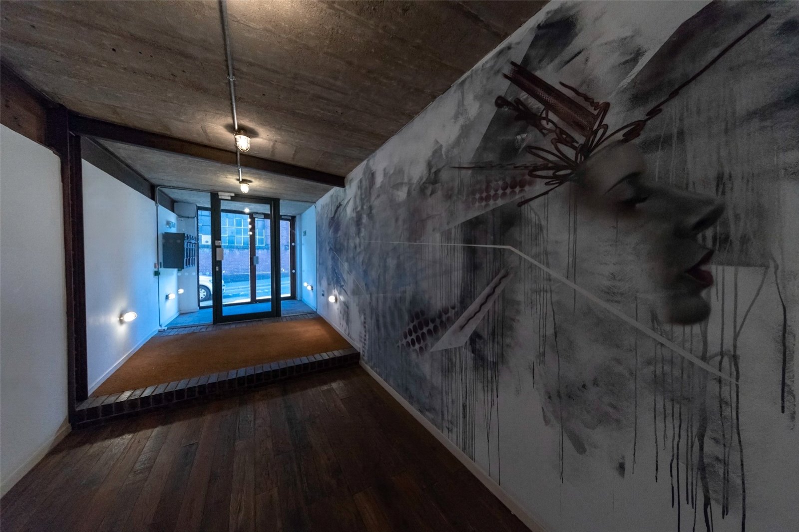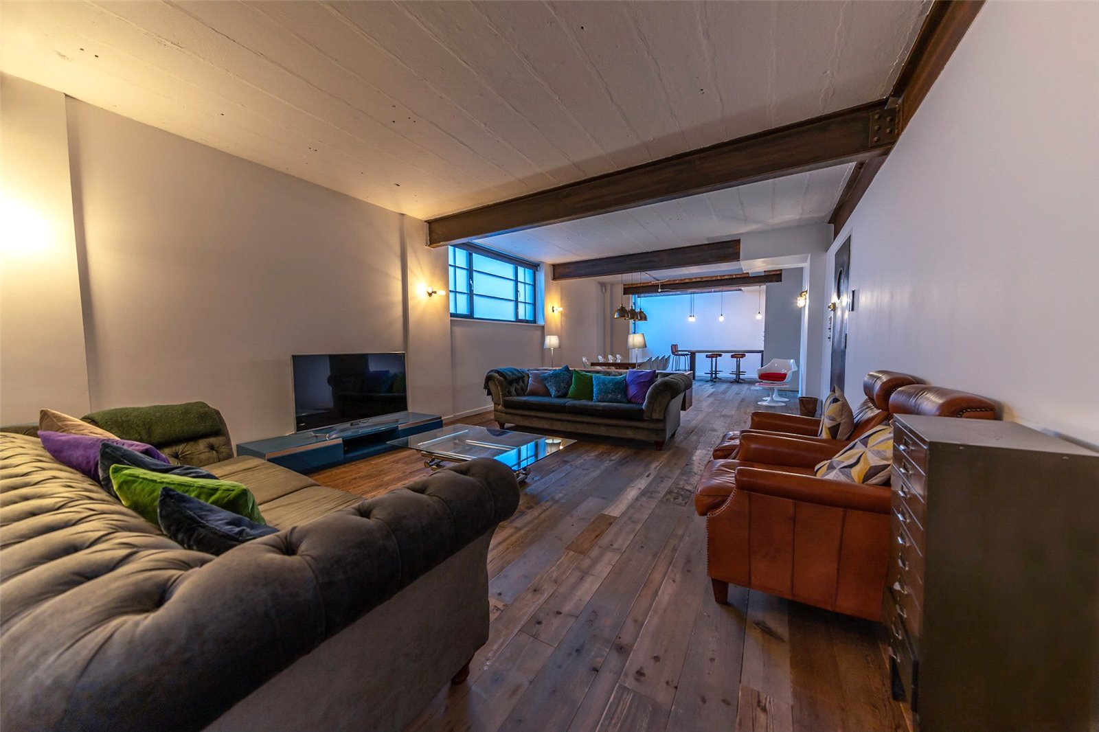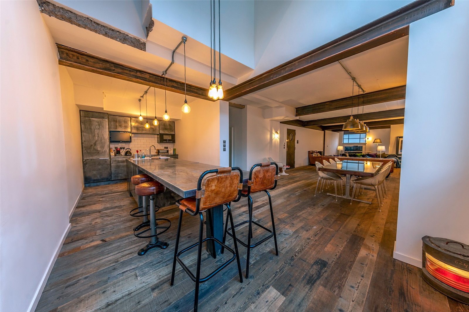 Accessed through the communal entrance, the front door of the apartment leads into a spacious reception room with ample space for a comfortable dining area without impeding on the living area. The flooring is made from reclaimed barn oak and has underfloor heating, there is reinforced double glazed windows and a painted concrete ceiling with exposed steel beams.